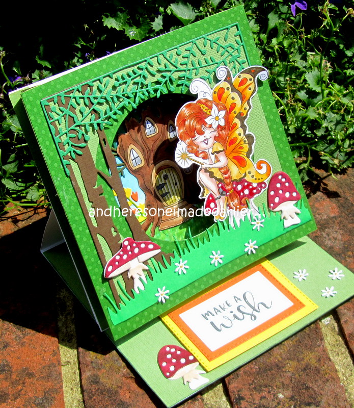 I made a tunnel easel card featuring the sweet Briar Berry Spry Fairy perching on her toadstool- so lovely to colour with my Copics, glitter pen added to the tips of her wings.