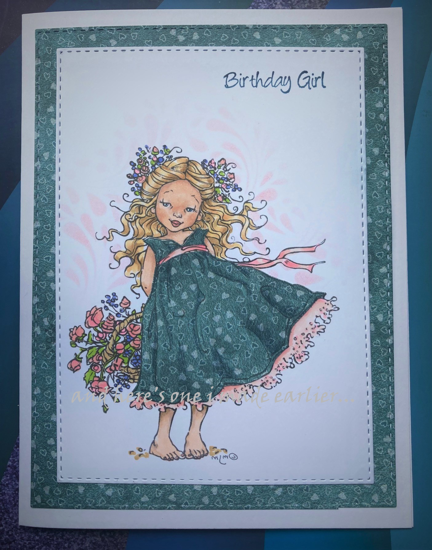 Little Easter Bunnies, this digi set comes with both a coloured and an uncoloured version as welll as background papers. I used the uncoloured one, printed it twice and coloured one with Copic markers. I coloured two of the bunnies on the second one and fussy cut them.I made a tent fold card with an egg shaped aperture, placing the complete image inside, then the two fussy cut bunnies on the outside of the card. I die cut some 'grass' and added tiny punched flowers, and a couple of punched butterflies coloured to match those on the image- two little pompoms for tails and I was finished!